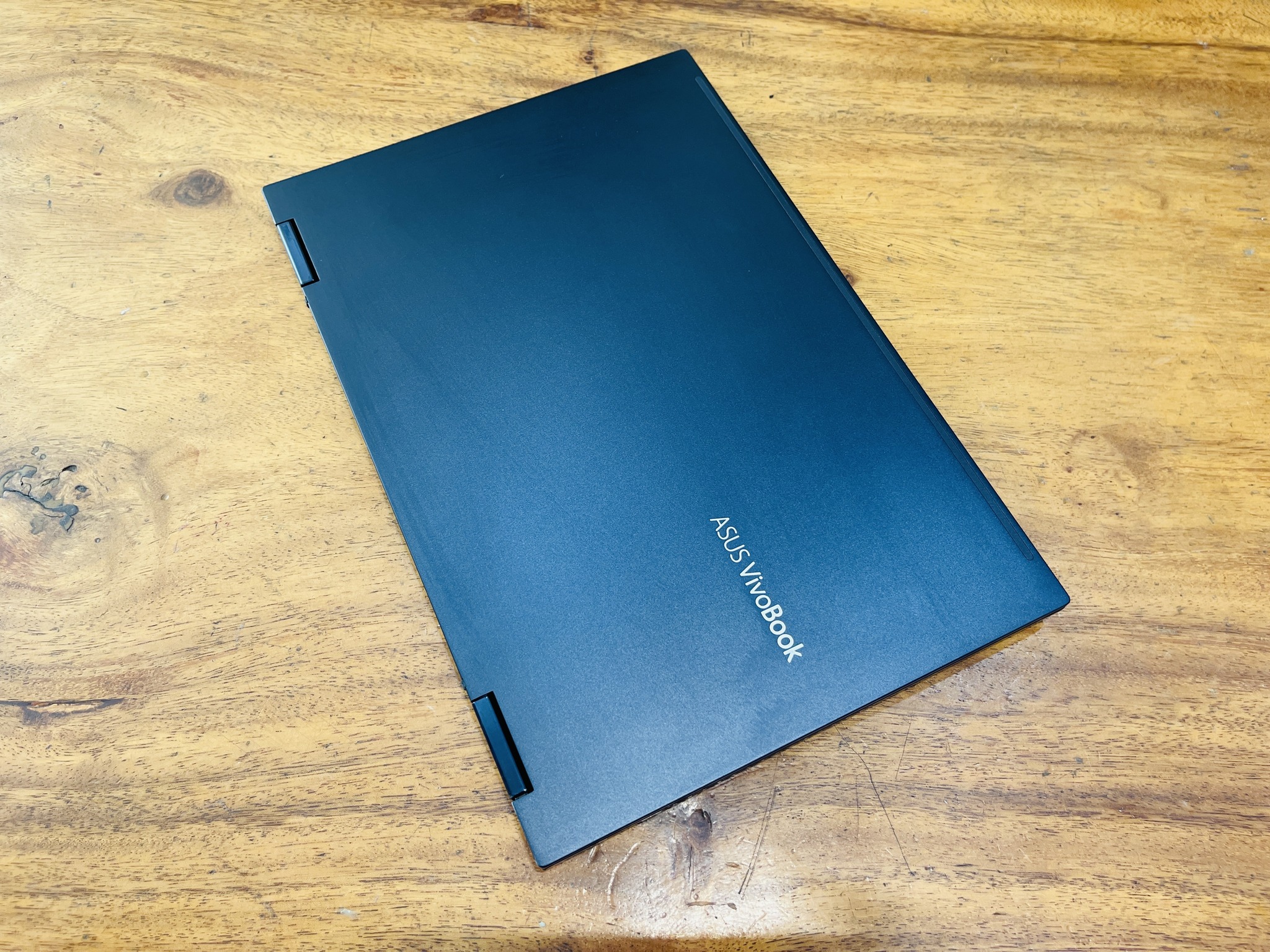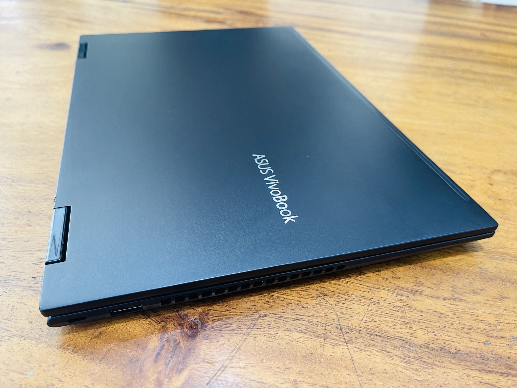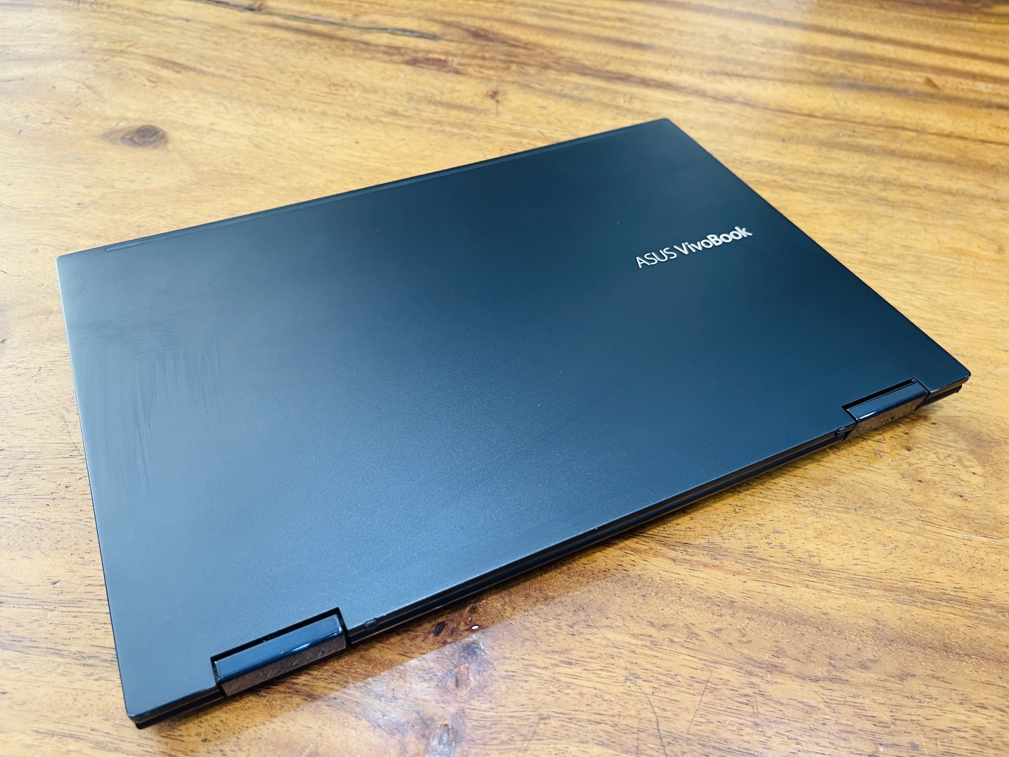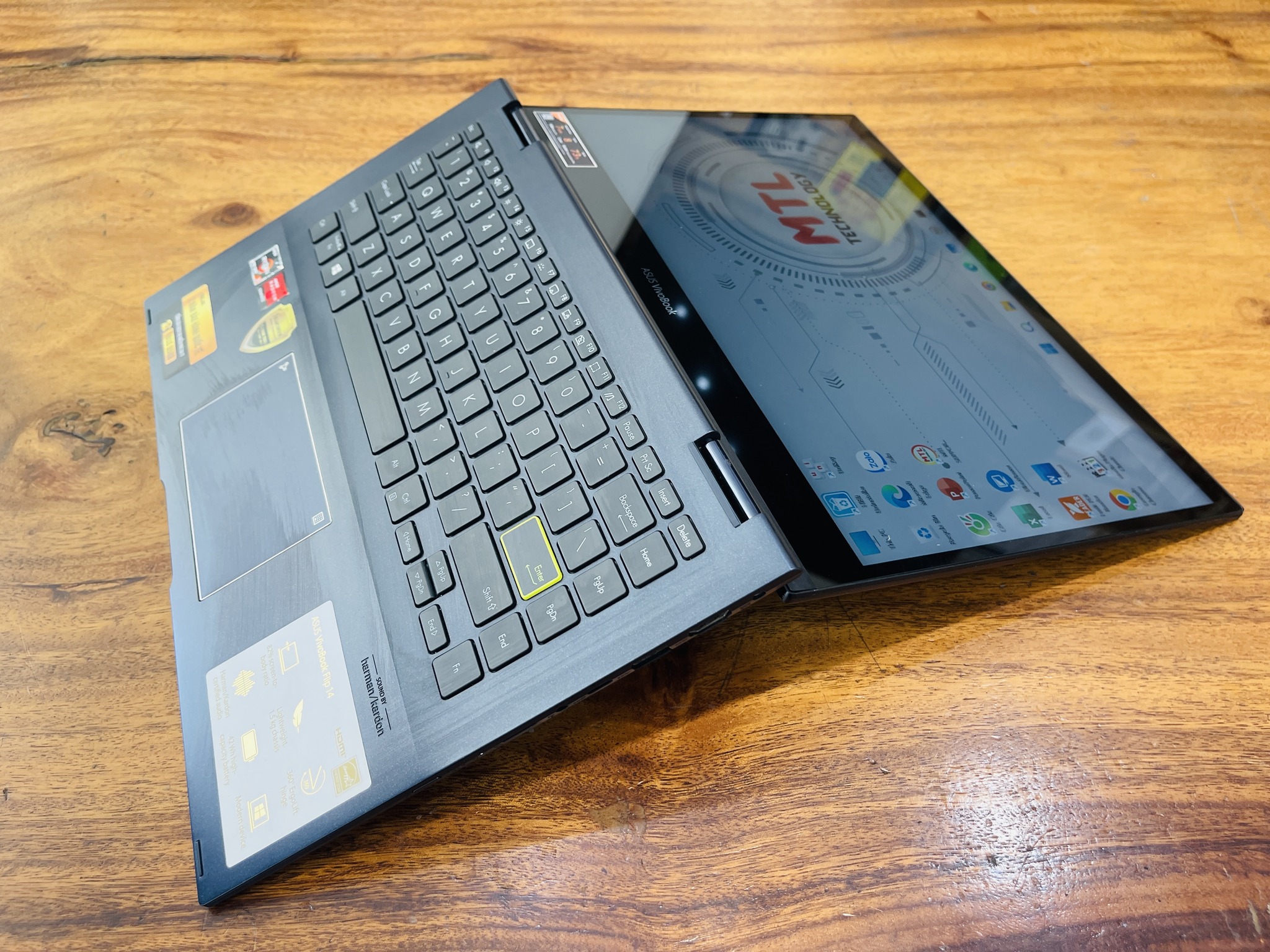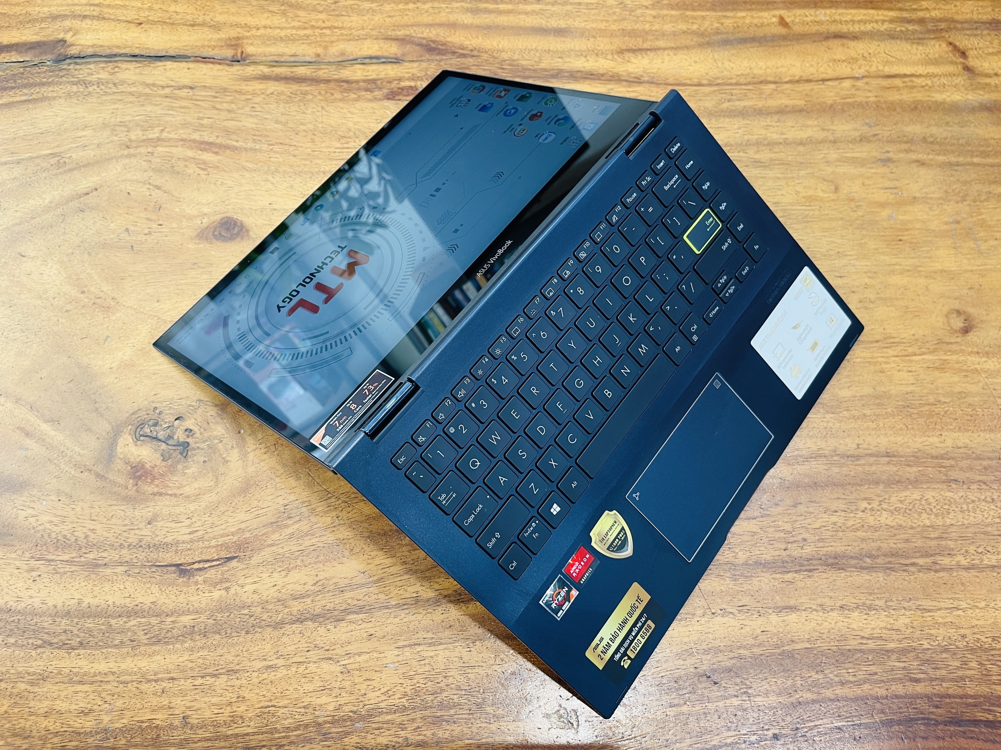 VivoBook Flip 14 bóng bẩy giúp bạn nổi bật nhờ khung kim loại Bespoke Black có kết cấu với cắt kim cương và phím Enter viền vàng.