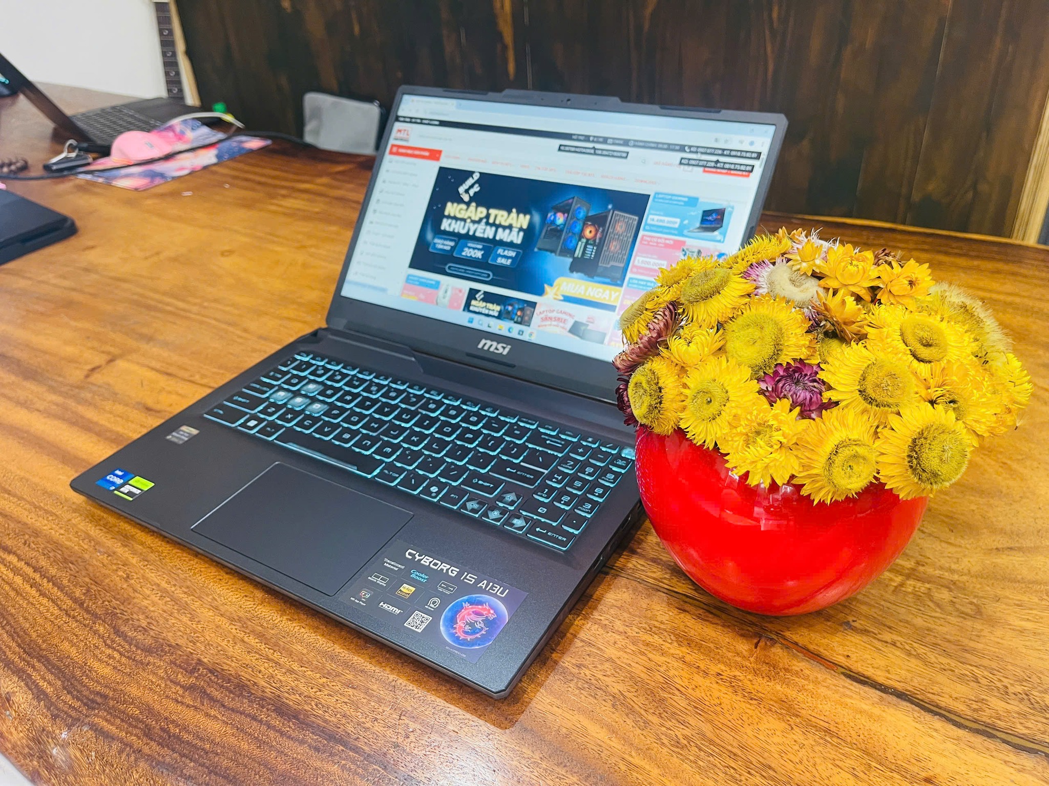 Dù thuộc nhóm laptop gaming, thiết bị vẫn giữ được cấu trúc gọn nhờ trọng lượng 1.98 kg. Kết hợp cùng nắp máy chế tác từ kim loại, Cyborg 15 A13UC-2082VN tạo cảm giác chắc chắn khi cầm nắm và duy trì độ cứng tốt khi hiện diện trong balo. Kiểu dáng gọn gàng này hỗ trợ người dùng di chuyển giữa lớp học, văn phòng hoặc không gian chơi game một cách linh hoạt mà không nặng tay.